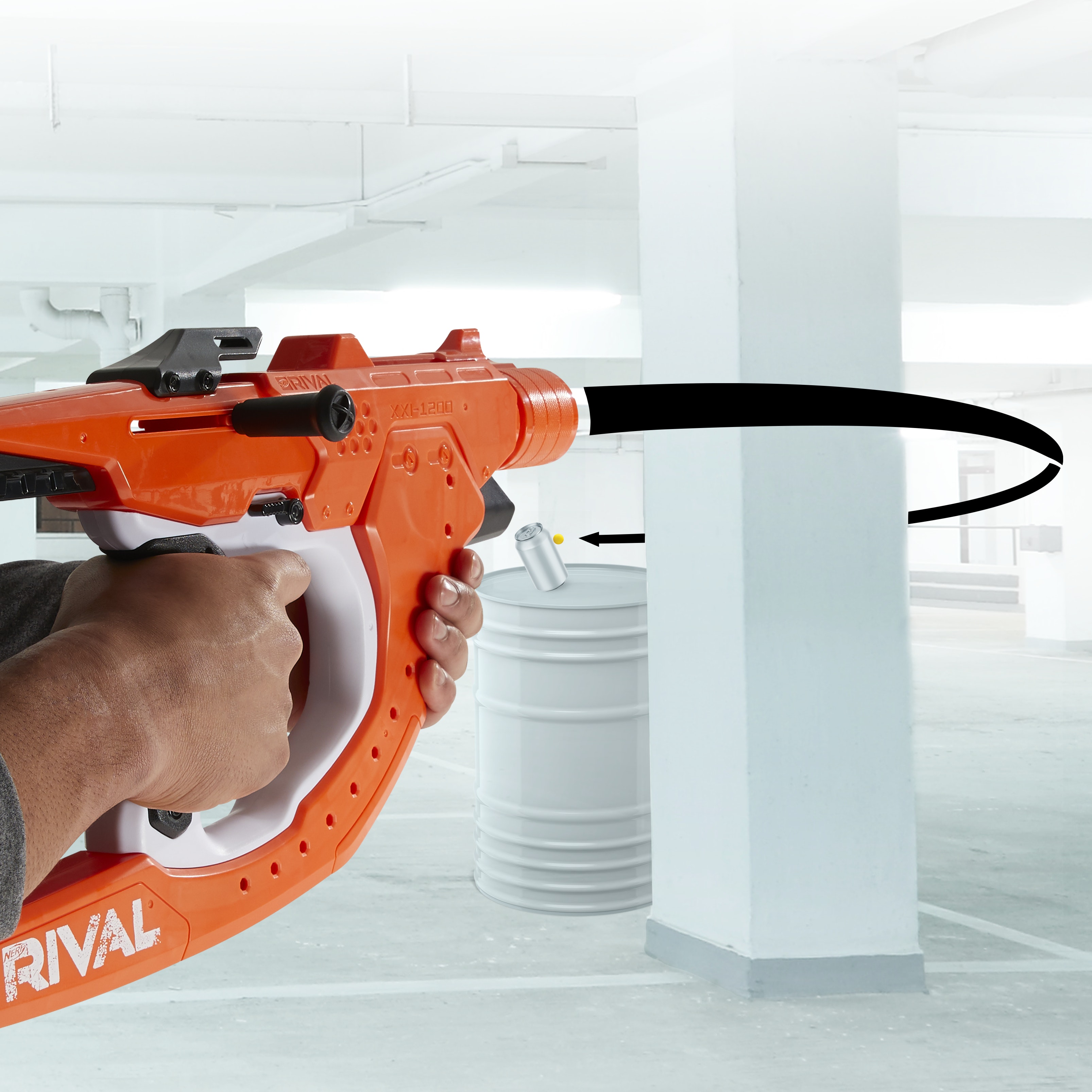 Select your curve to fire rounds left, right, straight, or down and take the competition by surprise with the NERF RIVAL CURVE SHOT SWIDESWIPE XXI-1200 blaster. Fire around corners, barriers, and obstacles with this blaster that unleashes rounds in a curved trajectory, giving you the ultimate strategic competitive advantage! Turn the rotating muzzle to choose whether you want the round to go straight, left, right, or down. Your opponents may be out of your line of sight, but with this NERF RIVAL CURVE SHOT blaster, they can still be within range, so take aim and curve your shot! Includes a 12-round side-loading internal magazine and 12 Official NERF RIVAL rounds. The bolt attaches to either side for right-handed and left-handed battlers. Load the magazine, move the priming bolt, and press the trigger to fire 1 round. Includes trigger lock. Eyewear recommended (not included). No batteries required. Available at most major toy retailers nationwide.