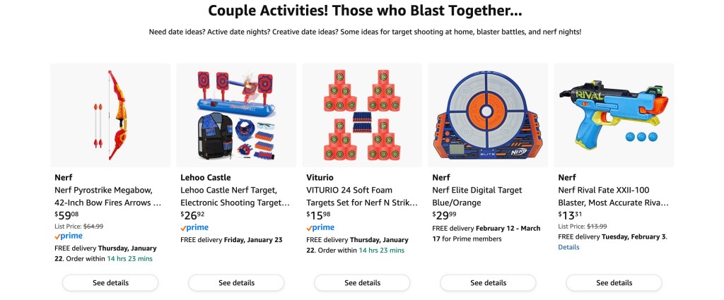 Target shooting and competitive Nerf/toy blaster battles can be a great ice breaker/date activity to keep things fun, loose, and a little bit safer than other activities. Check out my list of suggested items here –