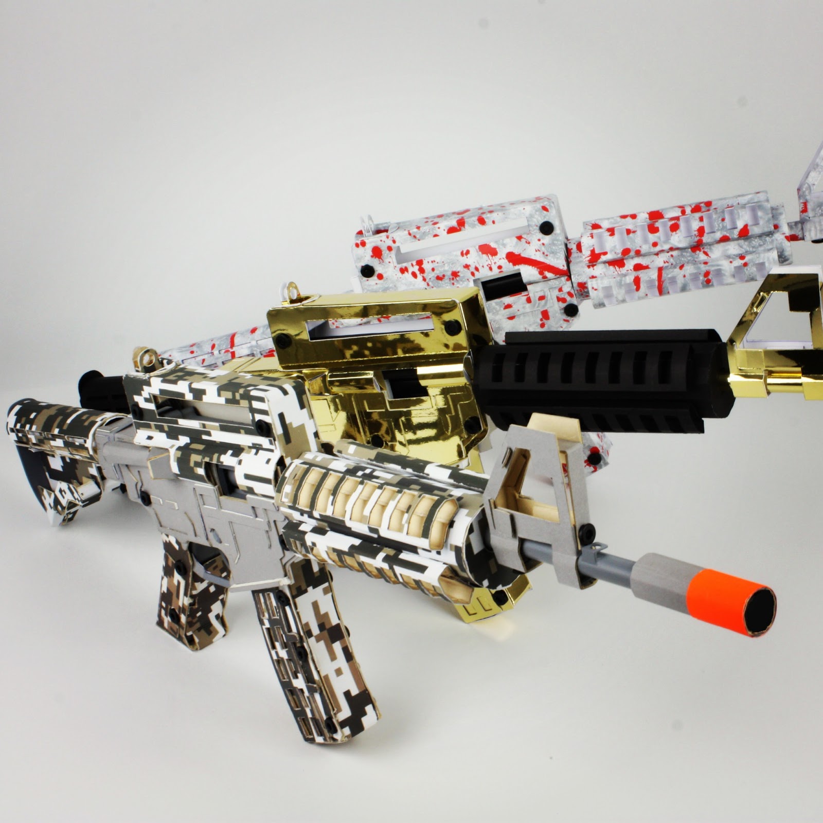 First, this isn’t the typical fare of shooter/blaster we’re used to seeing. These are construction kits moreso than a toy (think like making a model plane) where the end product is a replica (of sorts) of an m4 rifle. But this actually has a function and shoots projectiles. In this case, wet paper wads. The experience of building is the sell before target practice. If you mod your toy blasters, you know what I’m talking about. The kit is your starting ground. You have the option to build your blaster from the ground up (albeit being handed the pieces), craft your own ammo with the mould included, and customize as more pieces are available.