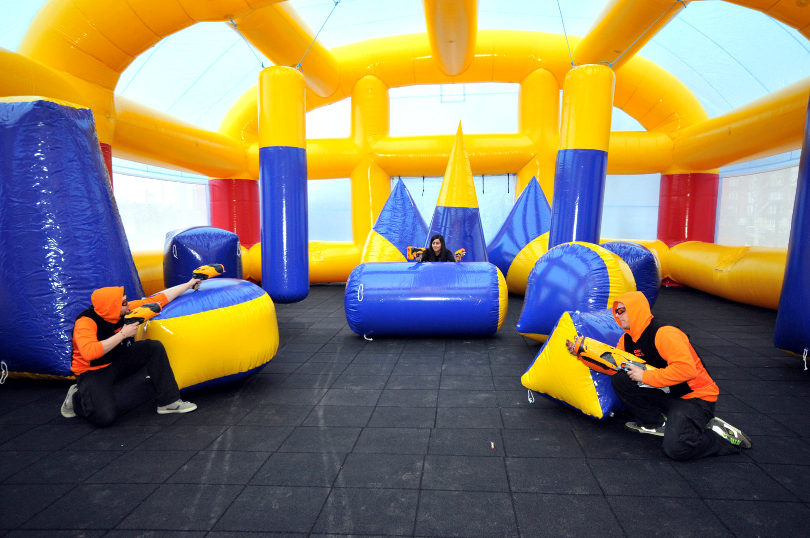 Performance wise, the blaster can be said to have more bark than bite. The ranges don’t seem much different from the initial product I saw at New York Toy Fair, and that was around 30′-50′. Angled or not, that was the most definite range. Not terribly different from the Sledgefire, but at least it had A WAY LARGER PAYLOAD (30 darts vs. 3+shell) and could be used as a shield (within certain gametypes). The spread wasn’t anything particularly astounding considering the 3 dart burst, and there was some loss of range on at least one dart in those bursts. The loss is usually where the 30′ mark came from. The key point is to consider this a truly close quarters blaster, and use it as such. If rules allow, use it as a shield. If they don’t, then be smart about aiming and when you try to run and gun with this blaster. The pump action is smooth, but the lack of a slamfire feature and again, the size for a short range blaster gives a player some extra tactical considerations.