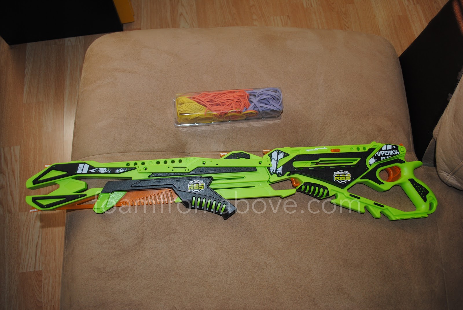 The Hyperion can use small, medium, and large rubber bands, has an ammo holder for each type, and an undermounted shooter that sprays rubber bands or can shoot a massive clump of them at once.