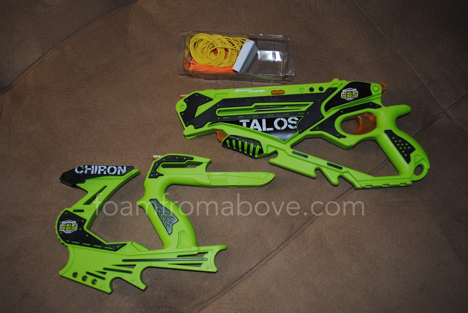 The Chiron adds an additional ammo holder and essentially a second manual shooter to go with the included Talos. Larger rubber bands may be shot on the Chiron as well when connected or separate from the Talos