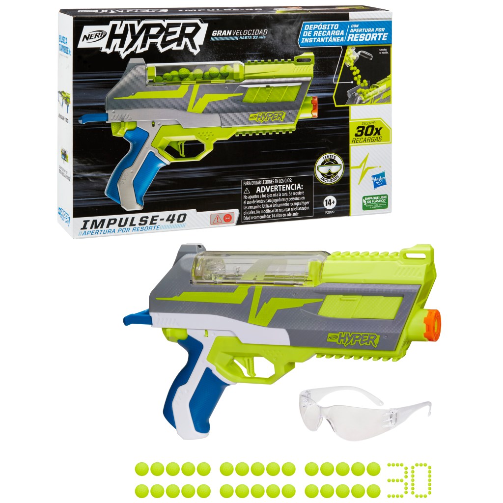 The Hyper Impulse 40 Blaster comes with 30 NERF HYPER rounds and has capacity for up to 40 rounds. Fires rounds at a velocity of up to 110 feet per second! Includes a draw-back priming handle. Attach NERF HYPER round reload canisters to the 2 tactical rails for fast, easy reloading. Outblast and outlast with the revolutionary NERF HYPER system that features extreme speed and massive round capacity! Includes required eyewear. Canisters and additional rounds each sold separately, subject to availability. Available for purchase at most major toy retailers starting January 2023.