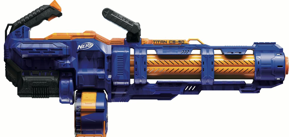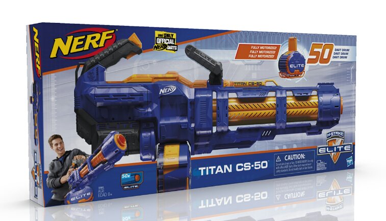 Take on targets with the power and size of a giant with NERF ELITE TITAN CS-50 toy blaster! This colossal blaster is fully motorized for rapid-fire dart-blasting and boasts a huge 50-dart drum to unleash a massive, 50-dart storm. It includes 50 Official NERF ELITE darts, enough to fully load the drum. Power up the motor and pull the trigger to pepper the playing field with a deluge of darts. The barrel spins as the blaster unleashes its darts to send opponents running for cover. Use the included shoulder strap to carry the blaster into battle. The blaster is compatible with most NERF ELITE dart clips and has integrated clip storage to keep back-up firepower nearby. Includes: blaster, 50-dart drum, 50 darts, strap, and instructions. Clip and additional darts not included. Requires 4 1.5-volt D batteries, not included. Available at most major toy retailers nationwide.