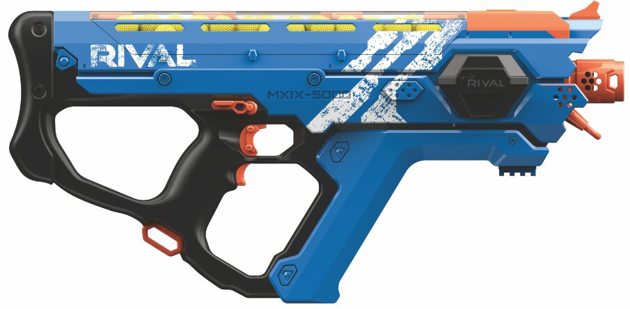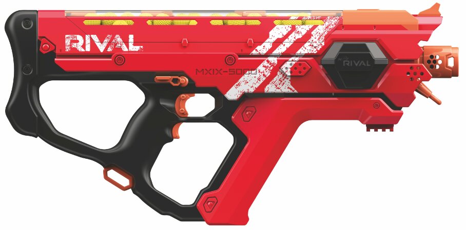 Experience the intensity of fully motorized, 50-round blasting with the NERF RIVAL PERSES MXIX-5000 blaster. This blaster features the fastest blasting NERF RIVAL system, so rev up the motor and rapid-fire up to 8 rounds per second to blanket the competition with a hailstorm of firepower! It includes a 9.6-volt 1200mAH rechargeable battery and wall charger, so there’s no need to stock up on batteries. The PERSES MXIX-5000 toy blaster comes with 50 Official NERF RIVAL high-impact rounds, enough to fully load the blaster’s high-capacity, easy-load hopper. Hold down the acceleration button to power up the motor, then pull the trigger to fire. The trigger lock prevents accidental firing.