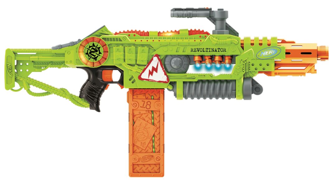 The zombie fighters created a way to generate power — and they tricked the zombies into running it! Electrify the zombie-fighting fun with the REVOLTINATOR blaster that has Power Shock electronic lights and sounds. When you power it up and fire, lights flash and glow in different places on the blaster, and it makes revving, blasting, and sparking sounds. This toy blaster comes with an 18-dart clip and 18 darts, giving you plenty of firepower to go up against the zombies. The blaster is motorized, so you can rev it up and shoot all 18 darts in a row with rapid-fire blasting. The 18 Official NERF ZOMBIE STRIKE ELITE darts are designed for distance and constructed of durable foam with flexible, hollow tips. Two tactical rails let you customize the blaster with ZOMBIE STRIKE accessories, sold separately. Shock the zombies with the sights, sounds, and power of the NERF ZOMBIE STRIKE REVOLTINATOR blaster! Includes: blaster, 18-dart clip, 18 darts, and instructions. Requires 4 AA batteries, not included. Available at most major toy retailers nationwide.