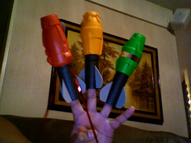 Stock, the blaster shoots these specialized rounds for particular signals, hence “Signal Launcher”. The yellow has a rubber band to hold a note, the red has streamers for added visibility, and the green one whistles through the air.