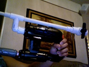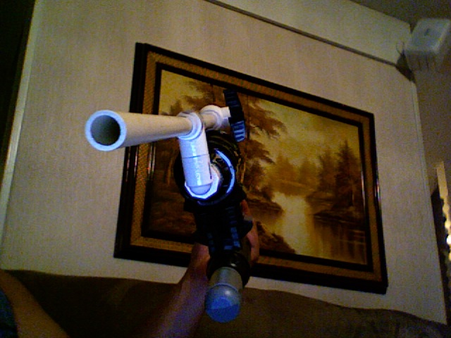 What you’re looking at is one of my new friends, the Spy Gear Signal Launcher by Wild Planet. I’ve modded it, but you can find stock pics HERE. I haven’t done anything to the pump, but that’s a seven shot 1’ish long clip on the back, complete with a 3/4″ ball valve for loading. The barrel is 1/2″ PVC, and it is awesome. I first grabbed one of these months ago, but I liked the stock look and signal features so much I never modded it. Then they became available for cheaper at Tuesday Morning, and I had to live the dream.