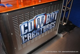 NERF battles mobilize when combined with remote-controlled COMBAT CREATURE robots! Using the handheld remote, fans can activate the all-terrain, 6-legged mobility, shoot Nerf darts up to an impressive 45 feet and use the aiming elevator and 360 degree rotation to hit their targets. Battle friends and activate rapid-fire blasting to shoot up to twelve NERF darts in a row, changing the direction of each shot to keep advancing robots at bay. 6 AA batteries required, not included. Available at most major toy retailers nationwide and on HasbroToyShop.com.