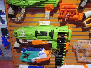 And what about N-Strike? Supposedly a new line called the “Vortex” line is going to be a whole new slew of innovative gameplay blasters, precluded by the “Gear Up” series of tiger-striped blasters: the Barricade Rev-10, the Raider CS-35, Recon CS-6, and the Maverick Rev-6. Much like the “Clear the Way” clear series of blasters preceded the Stampede. They were tight-lipped on the technical details about the upcoming Vortex line, so look for new details later this year at This Very Blog on hopefully something new.