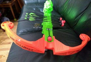 I like the way the Dreadbolt looks. The Zombie Strike junkdeco is still in effect, along with the green/orange motif. Nothing new or surprising there. The nuance of a wrench as the priming handle is a nice touch, and one of my favorite features of the blaster. Yes, nothing really new as it’s a crossbow reusing ammo from previous blasters, and the priming mech uses a a bowstring, but the fun is in the small details, like the priming arm wrench. It’s a smooth action with the priming handle too, and the stock is comfortable to hold. My frame is about 5’8″, and the stock is plenty comfortable for me to use. The blaster is a little front heavy though, and with the wrench positioned where it is makes finding a grip for your offhand a little odd sometimes (there’s a grip area after the wrench, but sometimes my hand kept finding its way further up the body naturally.) Overall, a nice job with a solid build. The arms make moving through tight spaces a bit more difficult, but hey, that’s a crossbow for you.