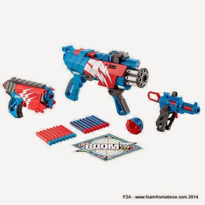 Looks like a line of flywheel blasters and I do believe that is a copied Nerf barricade as well as a reshell of the Powerstrike 48.  The darts are streamlined, and they have a huge rotor target that launches up and you shoot it down.  This requires some looking into.